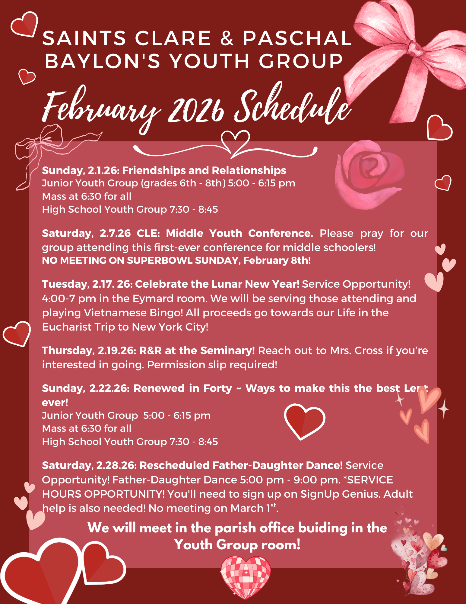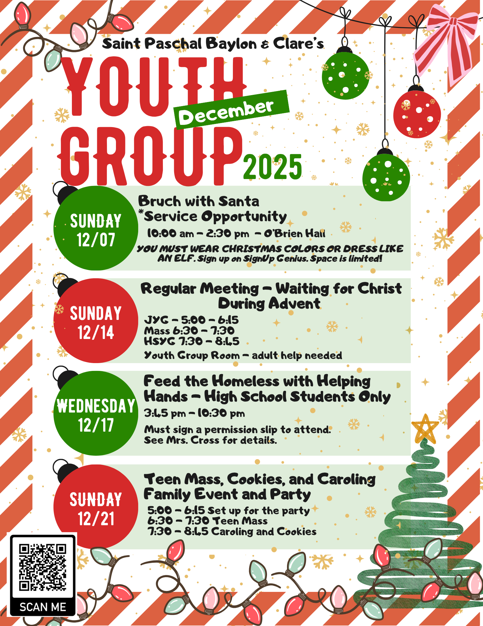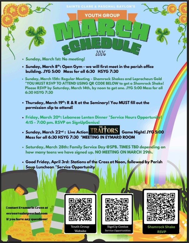 Saint Clare and Saint Paschal Baylon's Youth Group is open to anyone in 6th-12th grade.